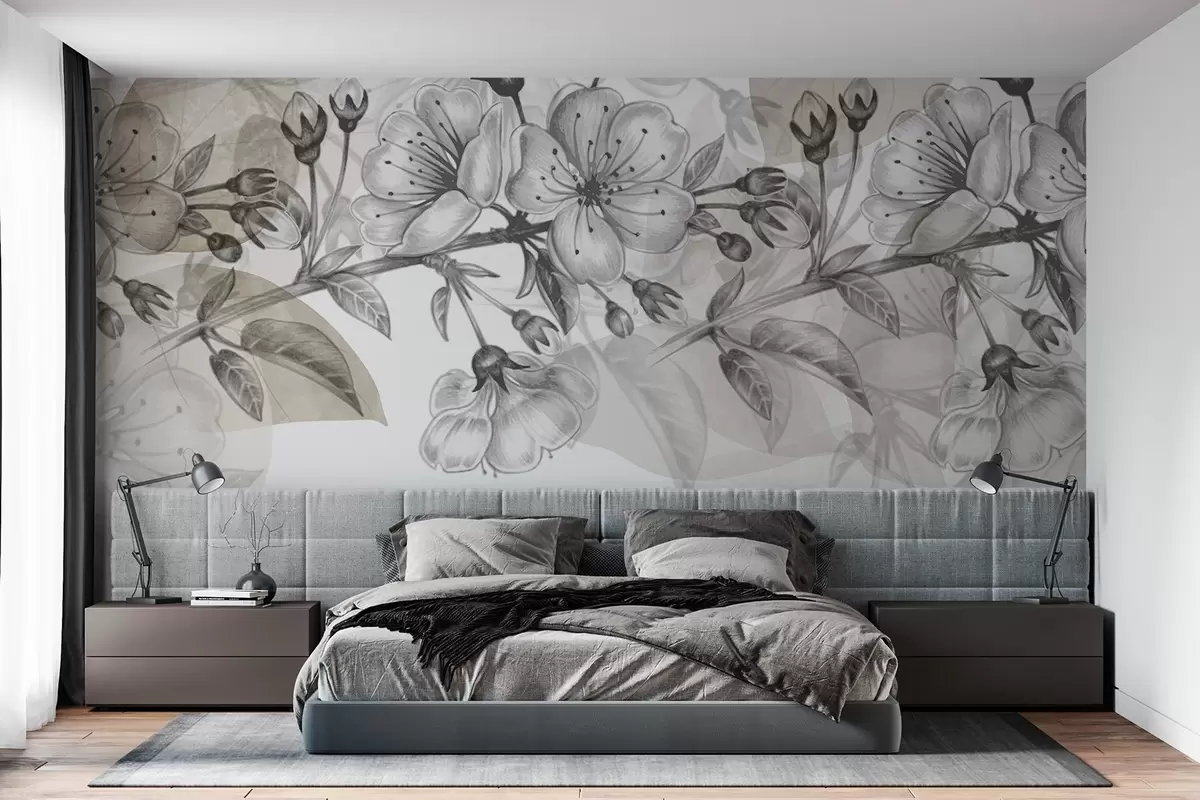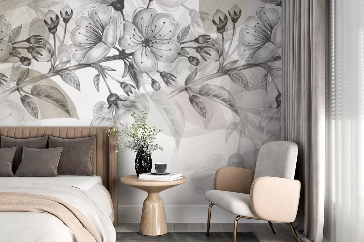 Тапете за зид Грана цвета трешње са цвећем и пупољцима, тонови сепије, мека позадина налик акварелу са сивим и смеђим нијансама бр. w09051v1