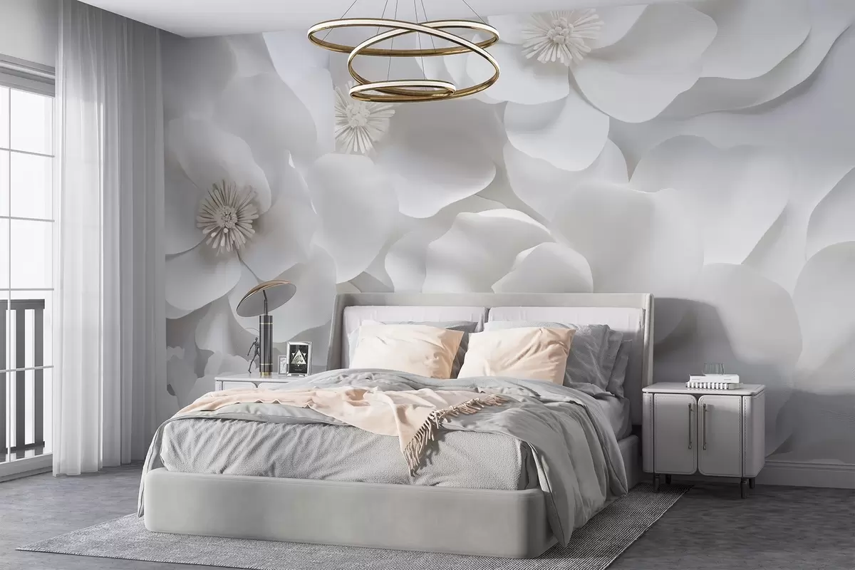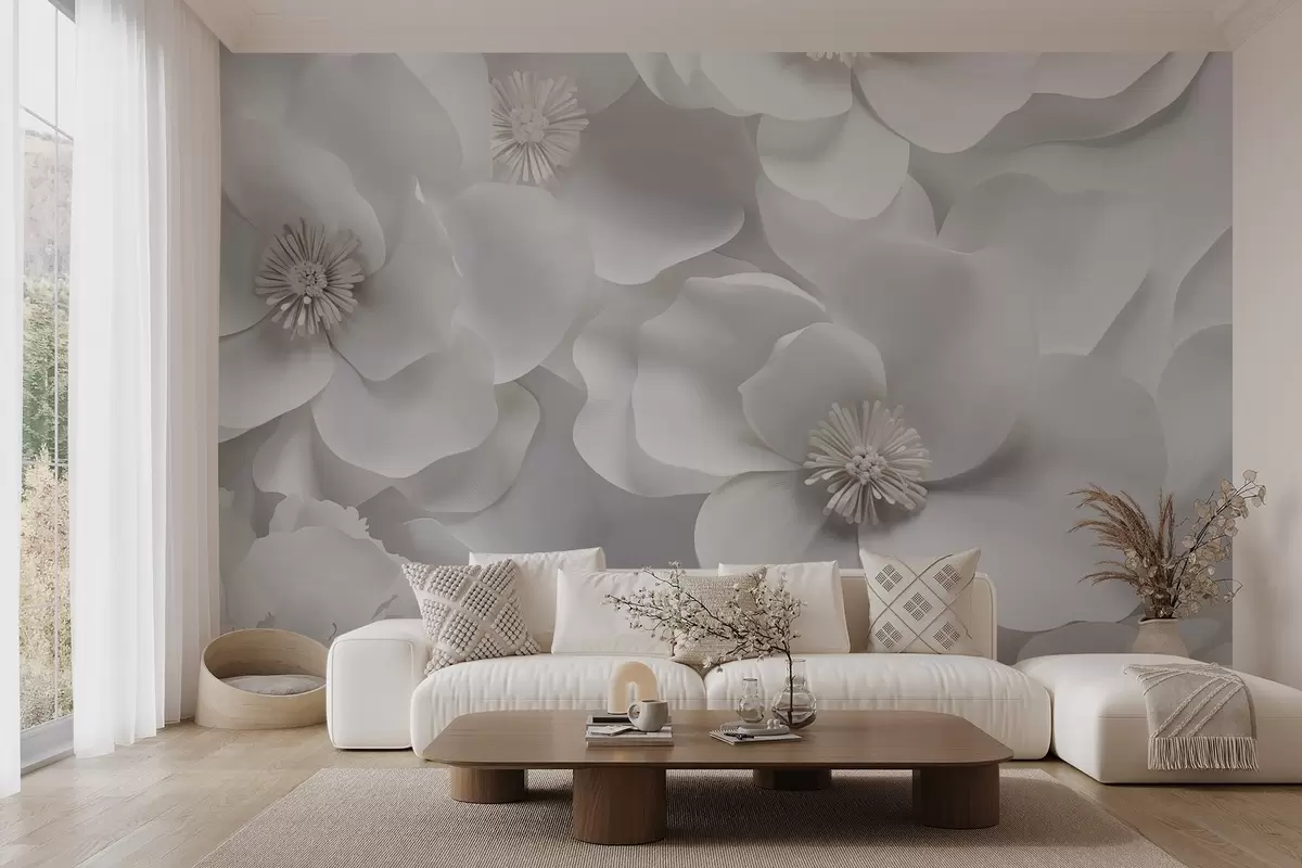 Тапете за зид Бели цветови са деликатним латицама, распоређени у густу грозд, стварају осећај чистоће и елеганције на белој позадини бр. w09053