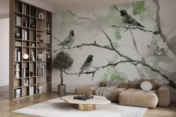 Тапете за зид Птице на гранама дрвећа у стилу акварела бр. w09064v3