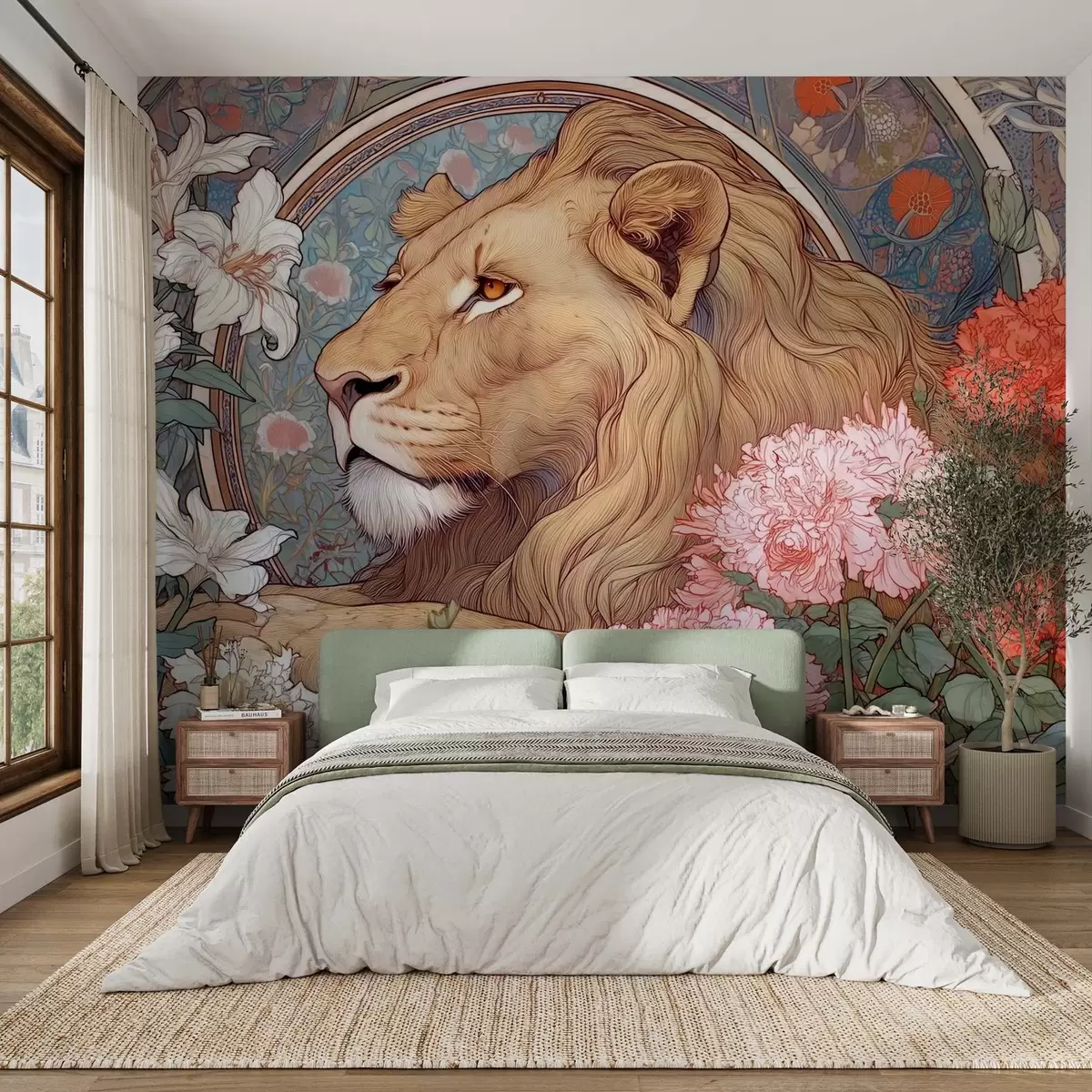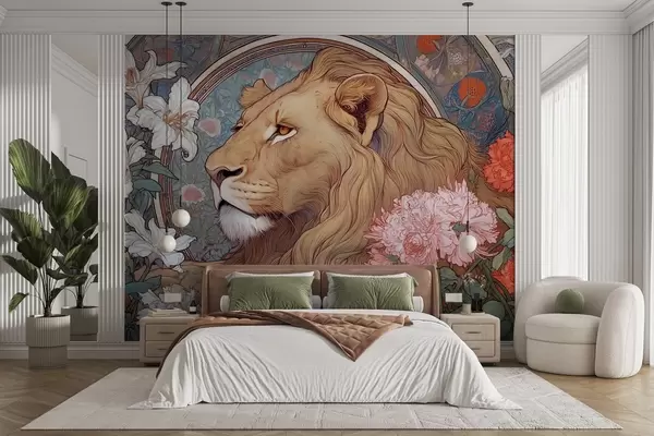 Тапете за зид Лав окружен мноштвом цвећа у стилу Алпхонса Мухе бр. w09073
