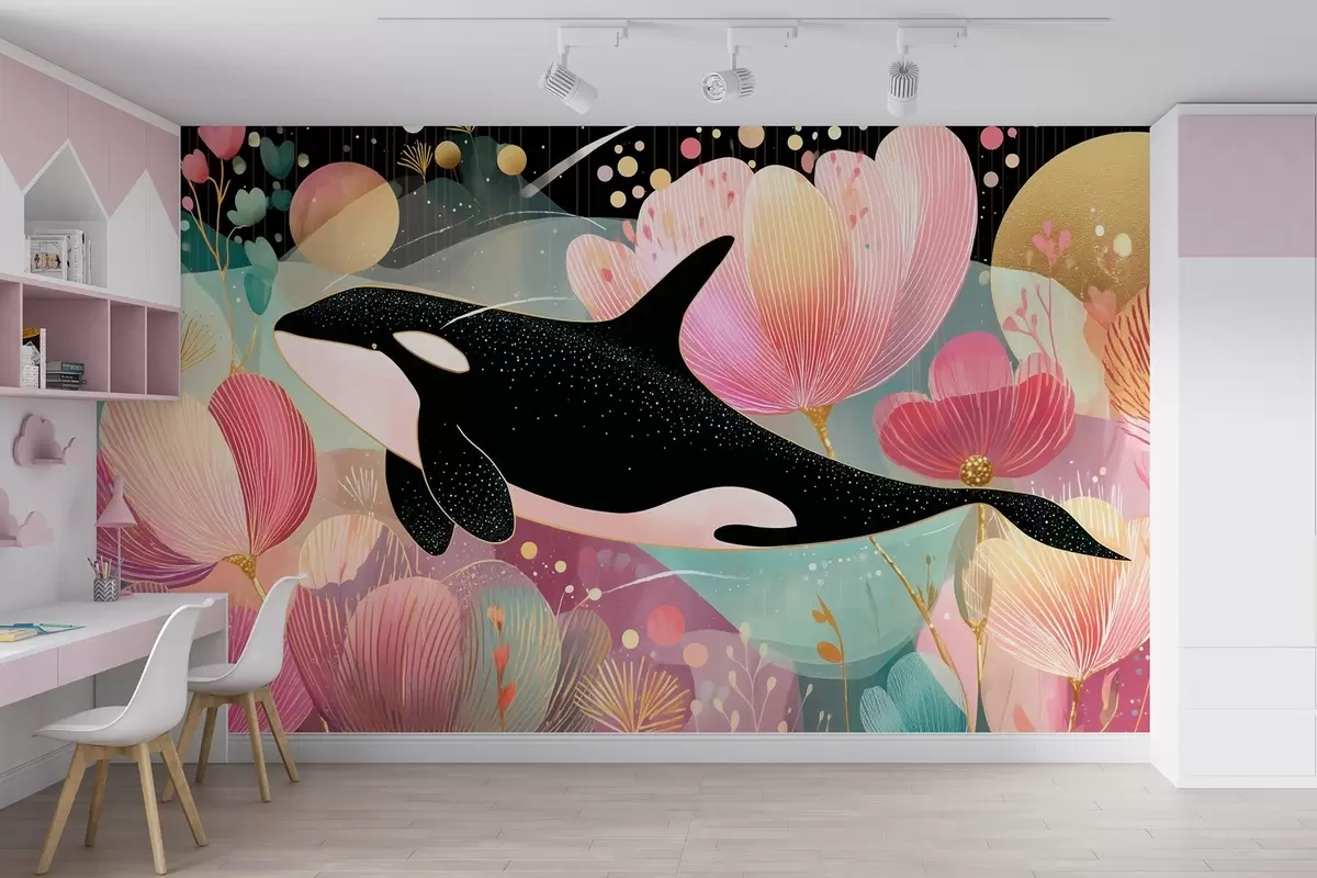 Тапете за зид Црна орка која плива на позадини ружичастог цвећа бр. w09074