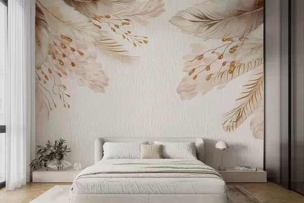 Тапете за зид Пампас трава и перје у стилу акварела у беж и белој боји на папиру бр. w09079