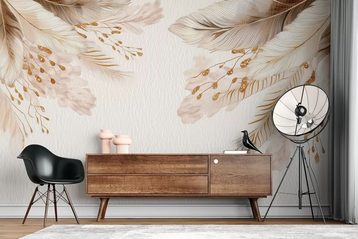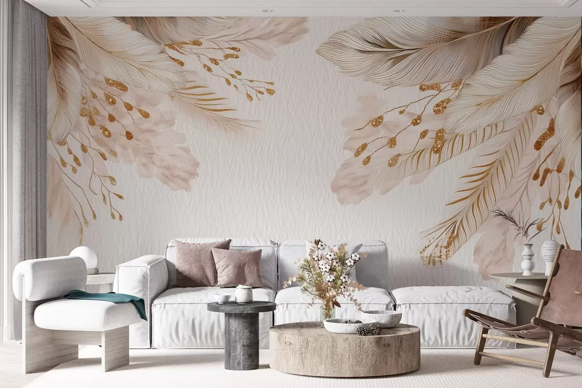 Тапете за зид Пампас трава и перје у стилу акварела у беж и белој боји на папиру бр. w09079