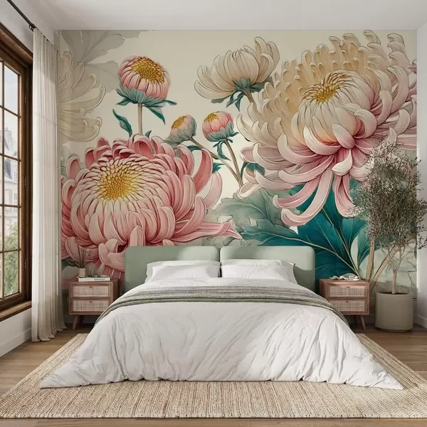 Тапете за зид Замршено сликање белих и ружичастих хризантема бр. w09081
