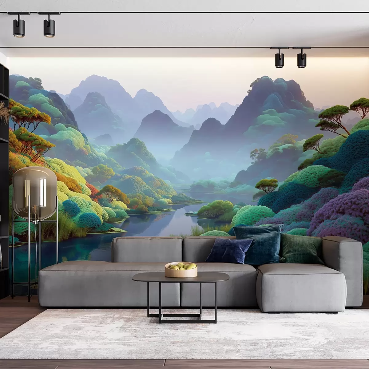 Тапете за зид Планински пејзаж са реком у плавим тоновима са дрвећем и жбуњем бр. w09088