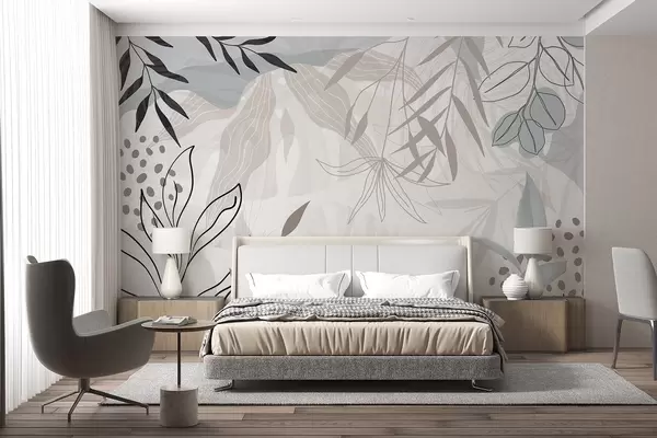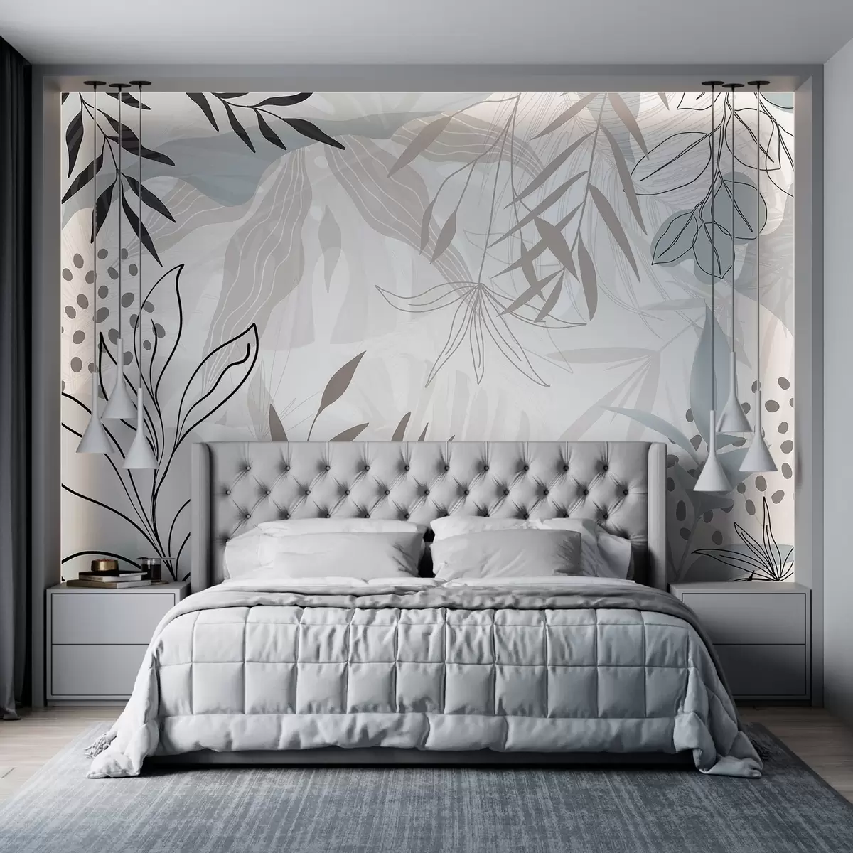 Тапете за зид Апстрактни цветни модерни дизајн са пастелно беж, сивим, плавим и црним листовима, нежном линијском уметношћу и меком позадином бр. w09105