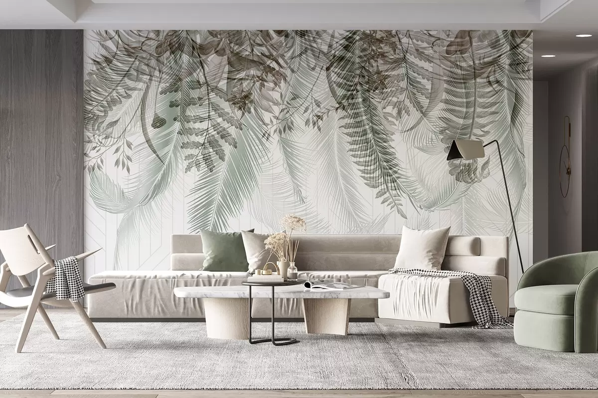 Тапете за зид Нежно падајуће тропско лишће папрати и палми, геометријска позадина, меко светло, пригушене боје, елегантно бр. w09106v1