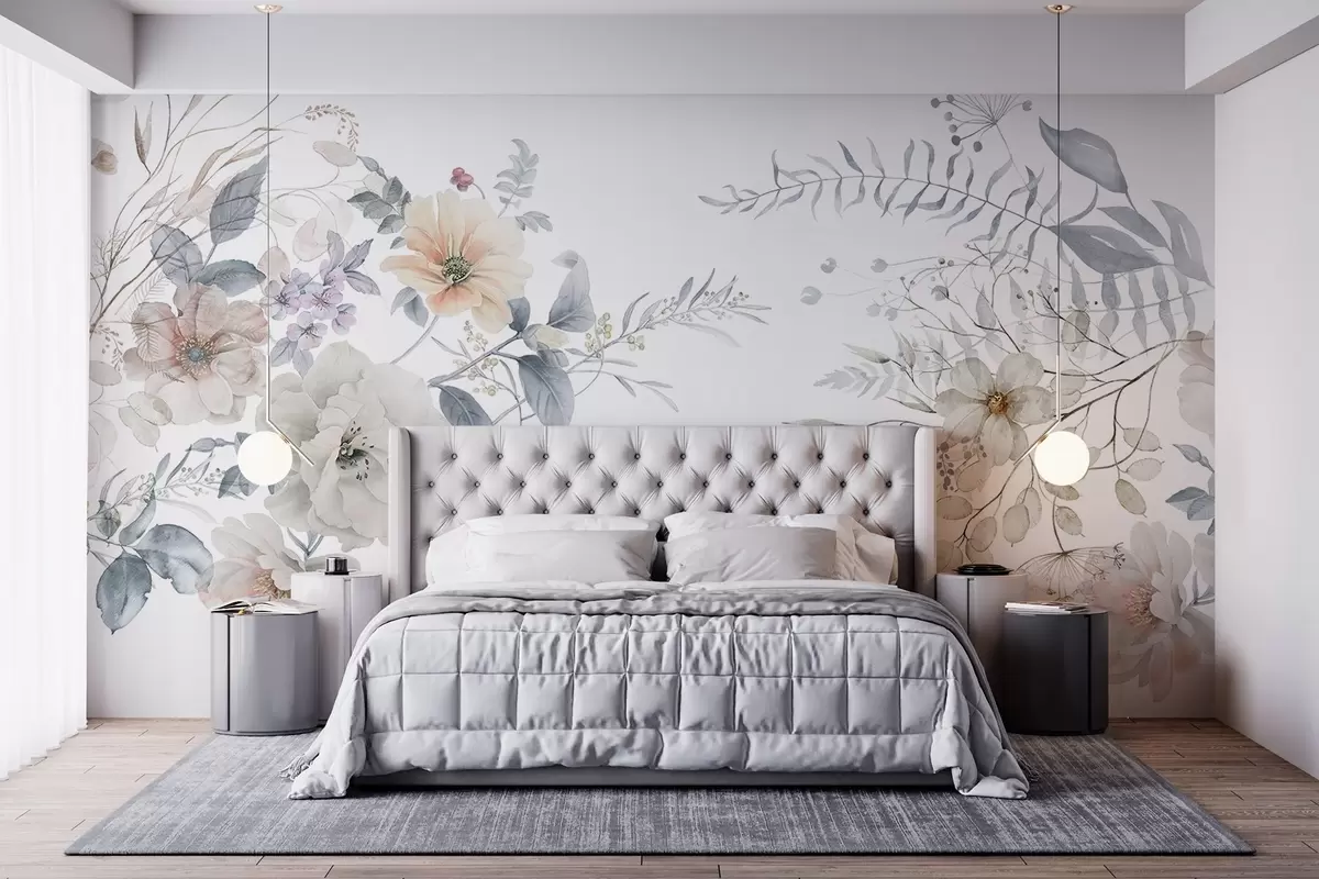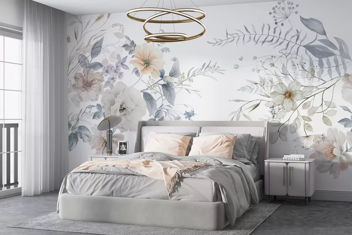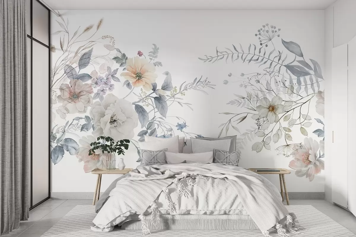 Тапете за зид Цветни аранжман у стилу акварела са белим, бресквастим и плавим цвећем, нежним зеленилом на белој позадини бр. w09108