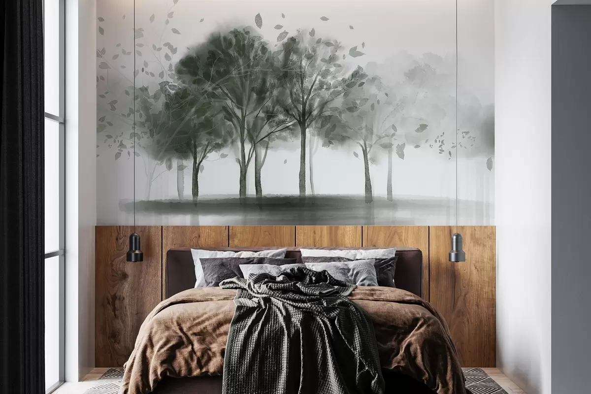 Тапете за зид Апстрактни пејзаж са дрвећем са зеленим лишћем које се огледа у води, у стилу акварела текстуре бр. w09109