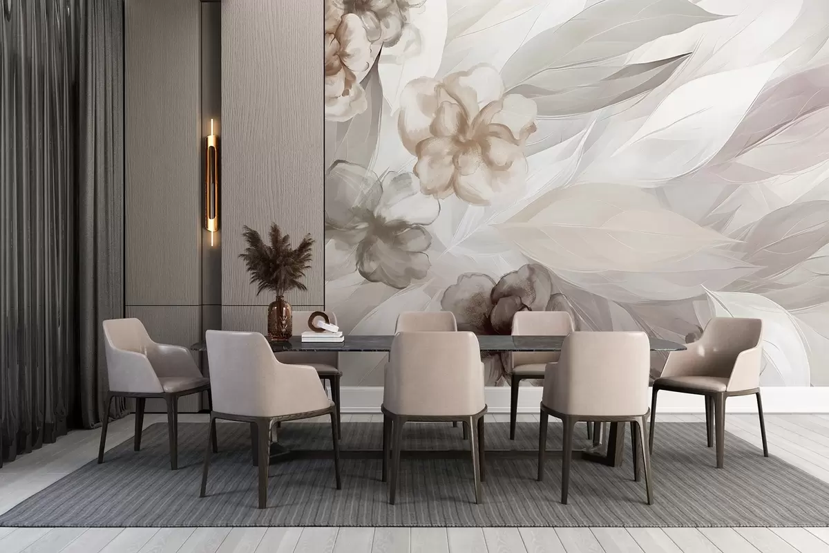 Тапете за зид Нежно цвеће и листови у нијансама беле, браон и беж цветне позадине, меке боје, нежне латице бр. w09111v1