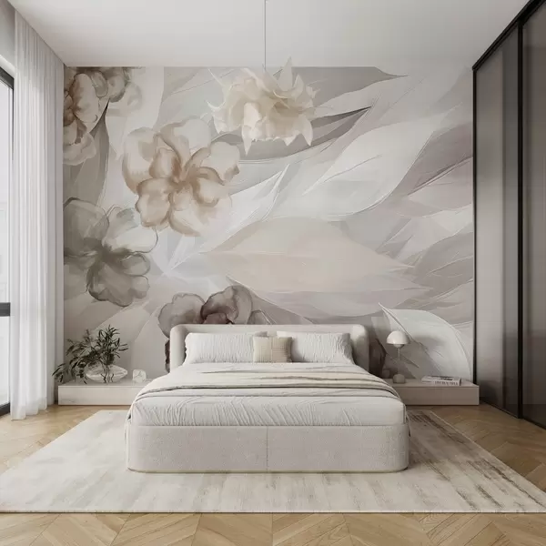 Тапете за зид Нежно цвеће и листови у нијансама беле, браон и беж цветне позадине, меке боје, нежне латице бр. w09111v1