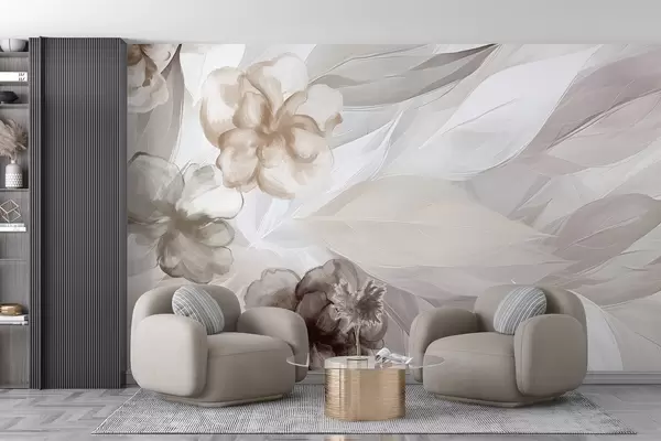Тапете за зид Нежно цвеће и листови у нијансама беле, браон и беж цветне позадине, меке боје, нежне латице бр. w09111v1