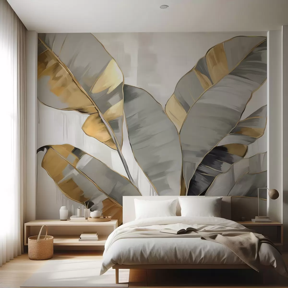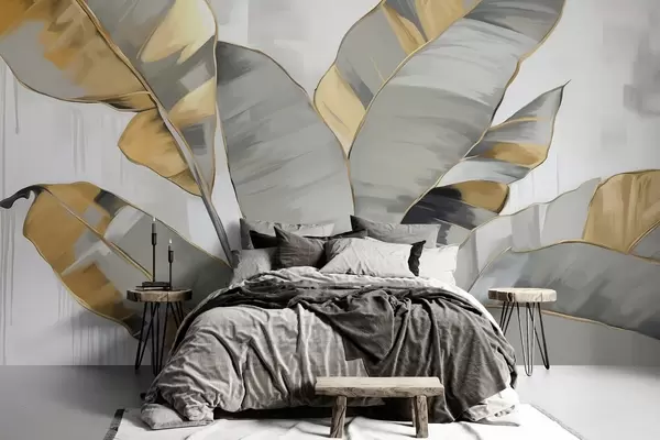 Тапете за зид Тропски текстурирани листови банане са сивим и жутим тоновима, модеран стил, неутрална позадина, декоративно сликање бр. w09118