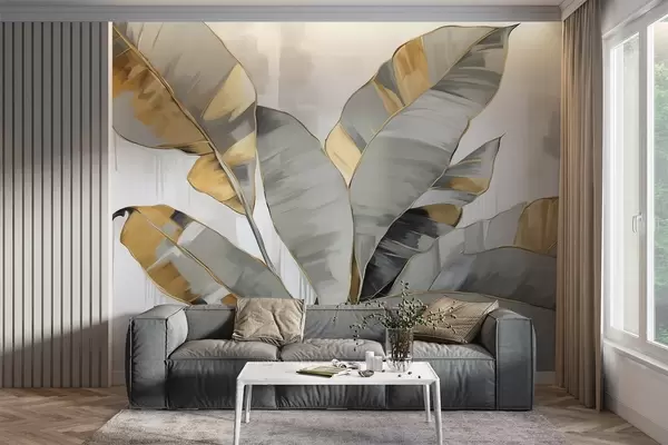 Тапете за зид Тропски текстурирани листови банане са сивим и жутим тоновима, модеран стил, неутрална позадина, декоративно сликање бр. w09118