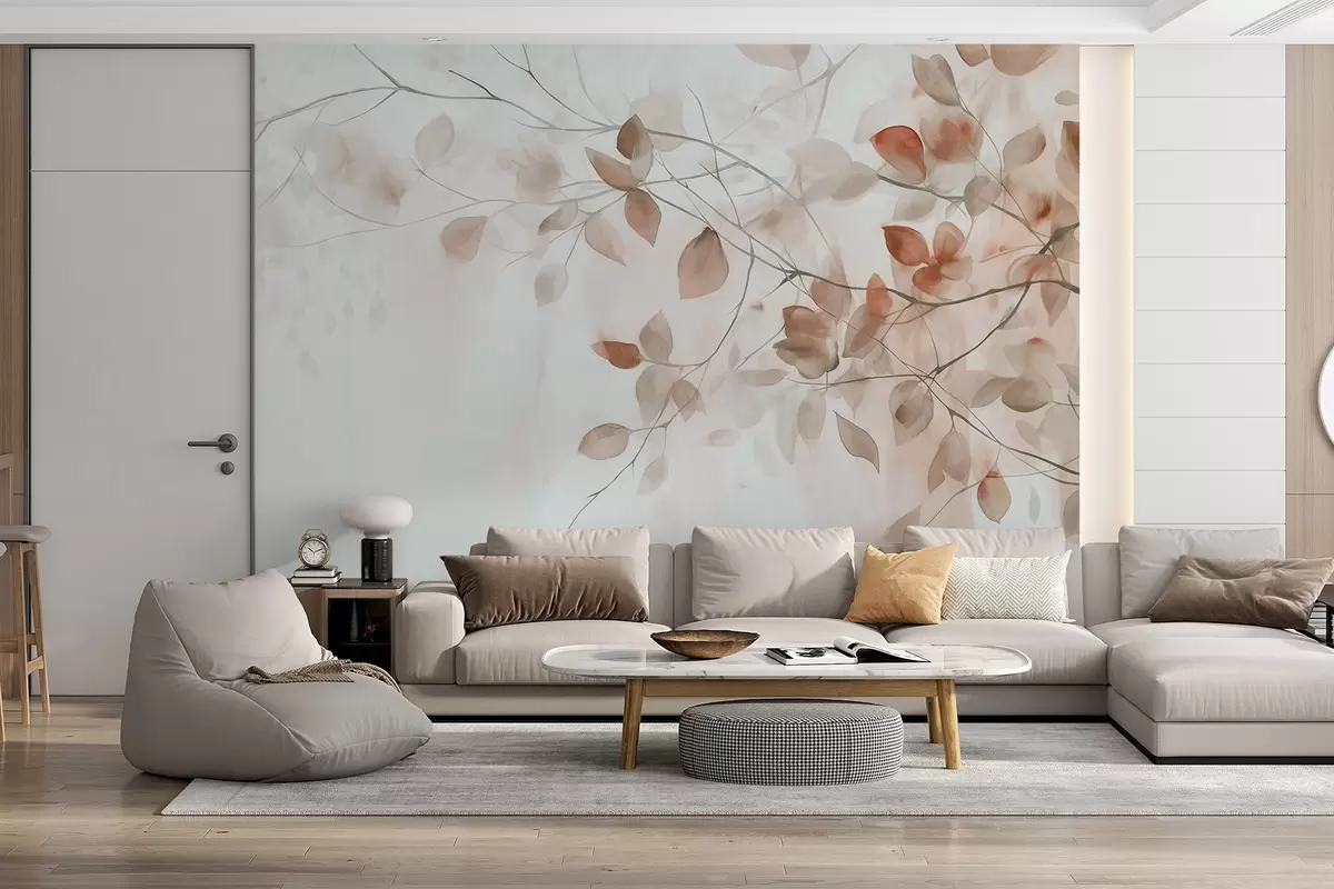 Тапете за зид Текстурна акварелна имитација смеђег лишћа и грана, меке боје, нежни детаљи на белој позадини бр. w09133