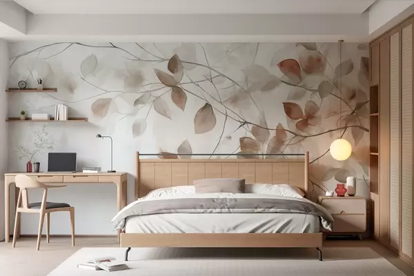 Тапете за зид Текстурна акварелна имитација смеђег лишћа и грана, меке боје, нежни детаљи на белој позадини бр. w09133