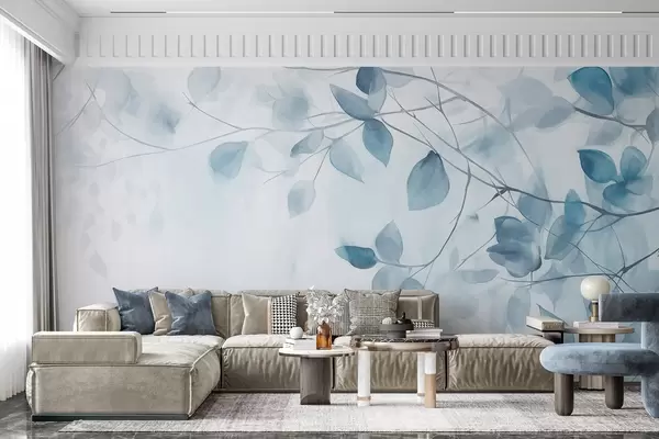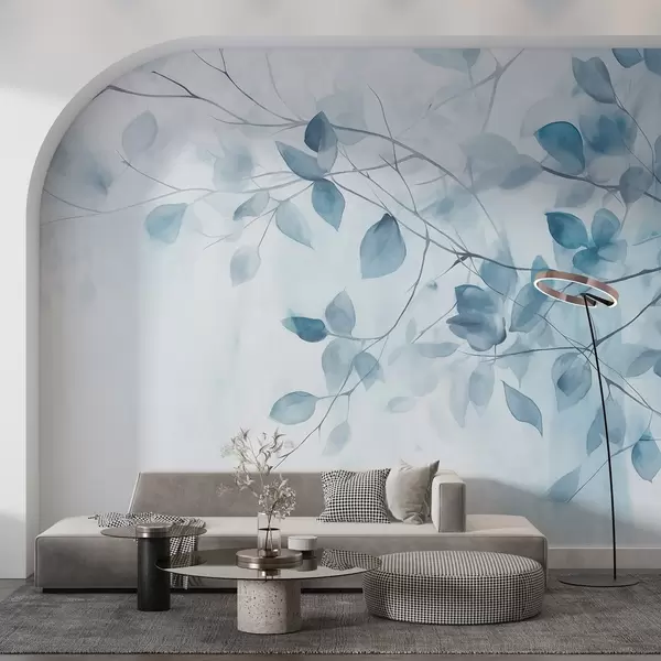 Тапете за зид Текстурна акварелна имитација плавог лишћа и грана, меке боје, нежни детаљи на белој позадини бр. w09133v1