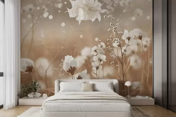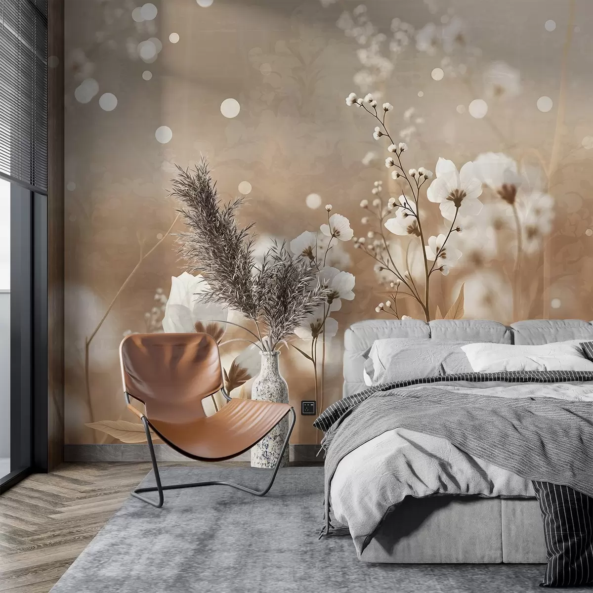 Тапете за зид Бело цвеће са смеђим стабљикама и листовима у пољу, ефекат бокеха, топла палета боја, елегантно уметничко дело инспирисано природом бр. w09135