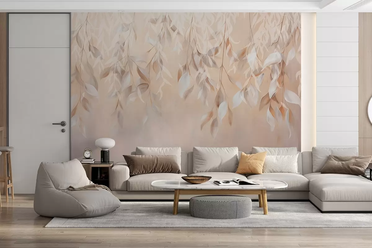 Тапете за зид Висеће текстурирано бело и беж лишће са меком палетом боја, бресквастом, сивом и белом нежном позадином бр. w09136
