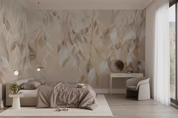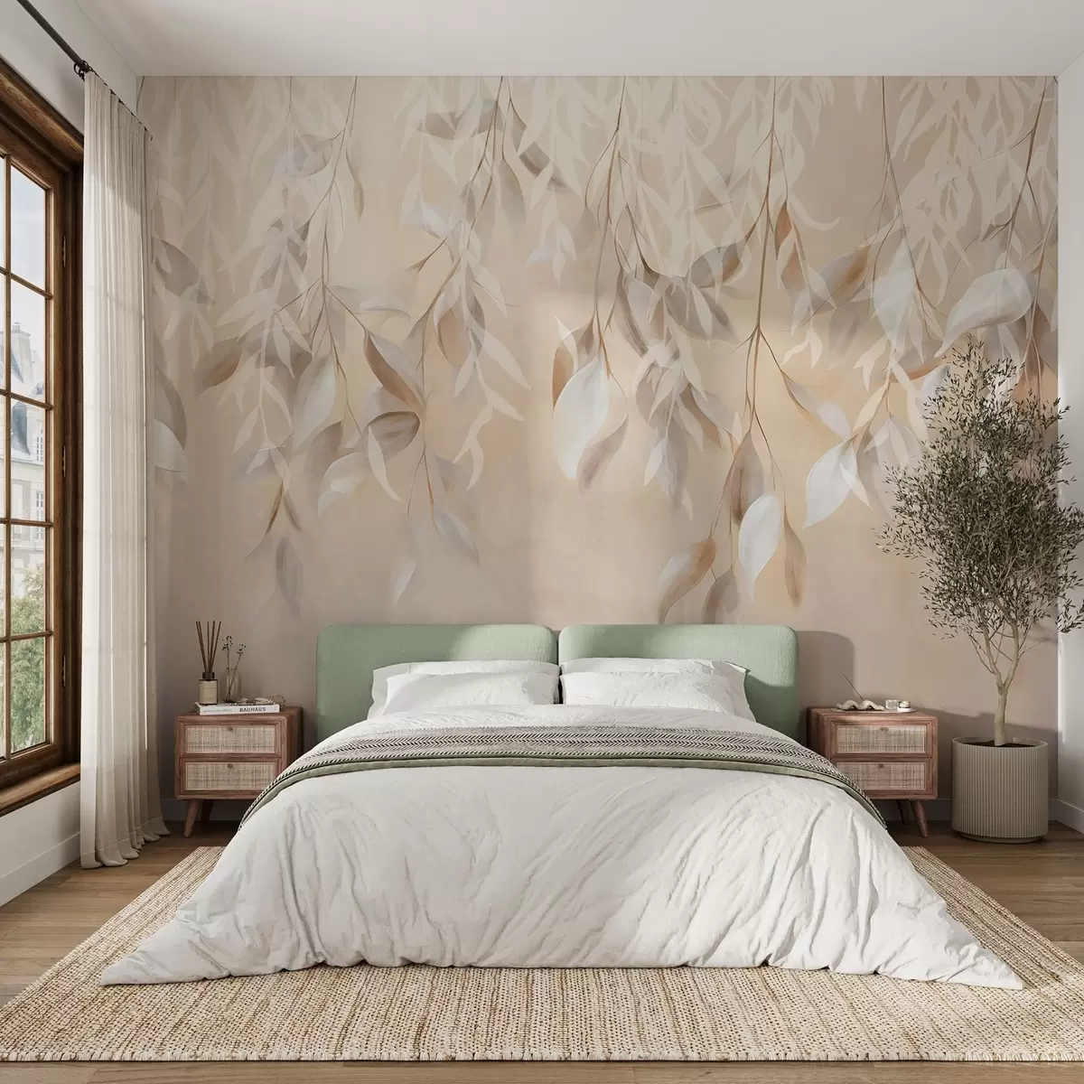 Тапете за зид Висеће текстурирано бело и беж лишће са меком палетом боја, бресквастом, сивом и белом нежном позадином бр. w09136