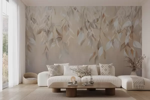 Тапете за зид Висеће текстурирано бело и беж лишће са меком палетом боја, бресквастом, сивом и белом нежном позадином бр. w09136