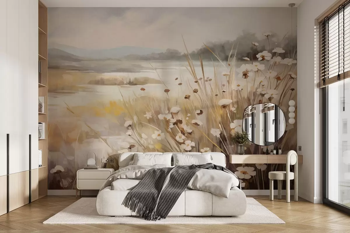 Тапете за зид Поље високе траве и белих тратинчица, дрвеће у позадини, под облачним небом, текстурирани пејзаж, меки потези четкицом бр. w09139