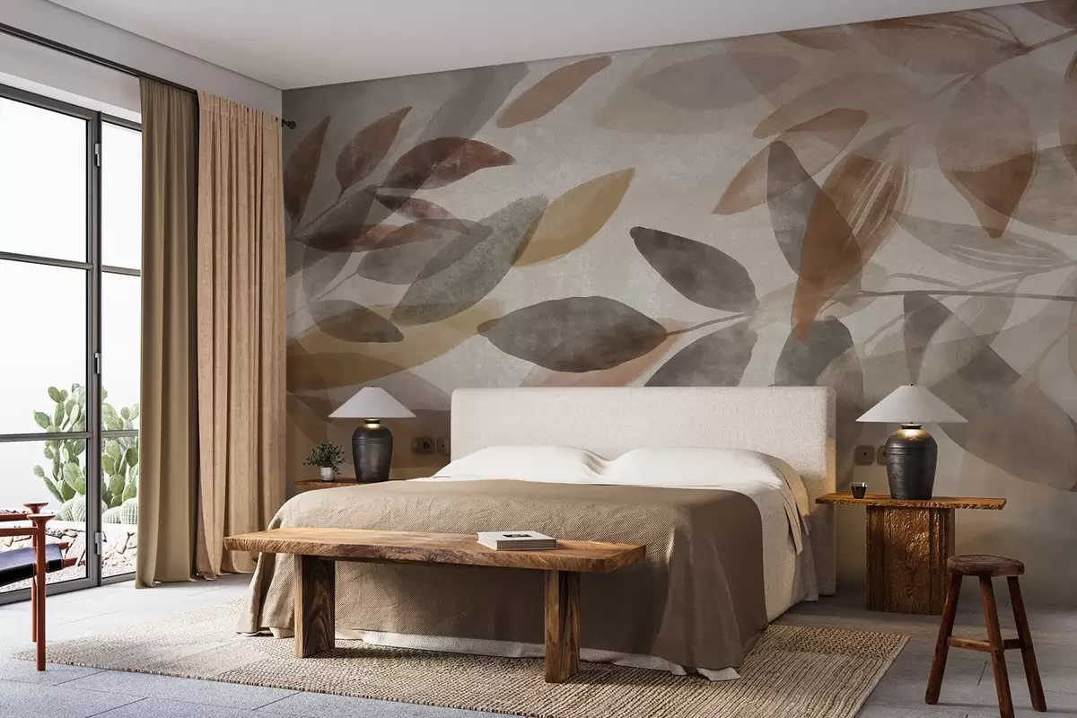 Тапете за зид Апстрактно текстурирано лишће у пригушеним смеђим, беж и сивим тоновима, провидни облици, минималистички стил, органски облици бр. w09140