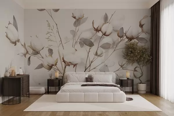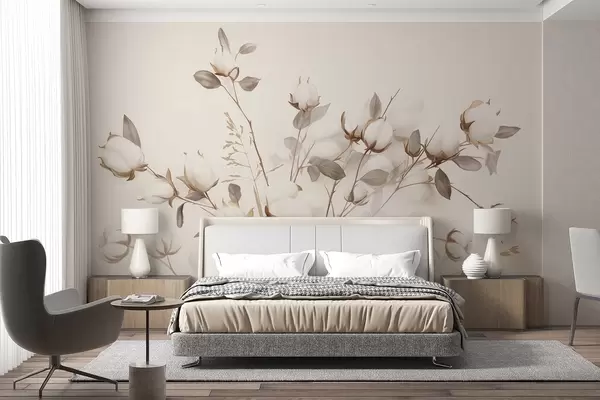 Тапете за зид Памучно цвеће са стабљикама и листовима у светло смеђој палети боја, беж позадина, меко и нежно, акварел стил бр. w09141