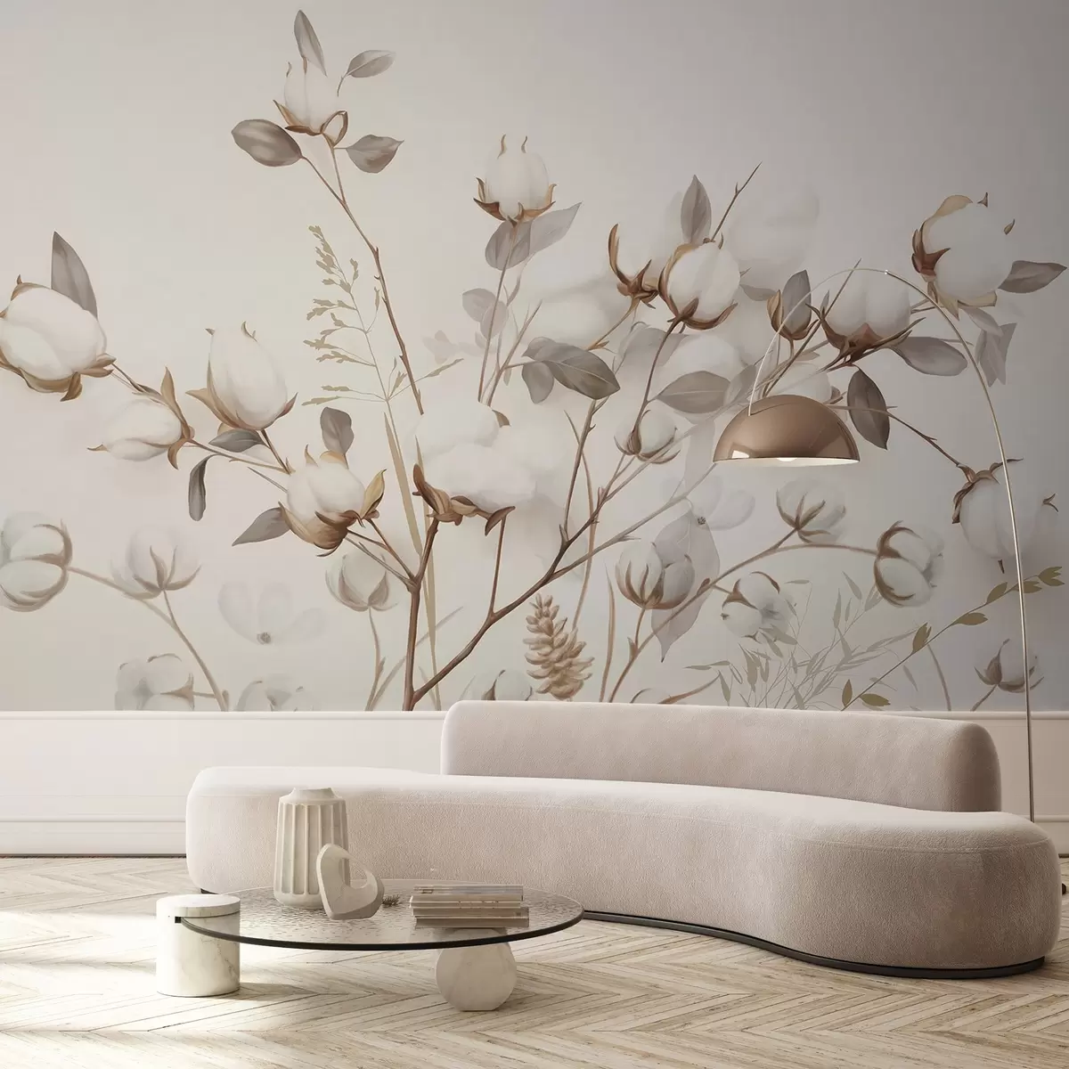 Тапете за зид Памучно цвеће са стабљикама и листовима у светло смеђој палети боја, беж позадина, меко и нежно, акварел стил бр. w09141