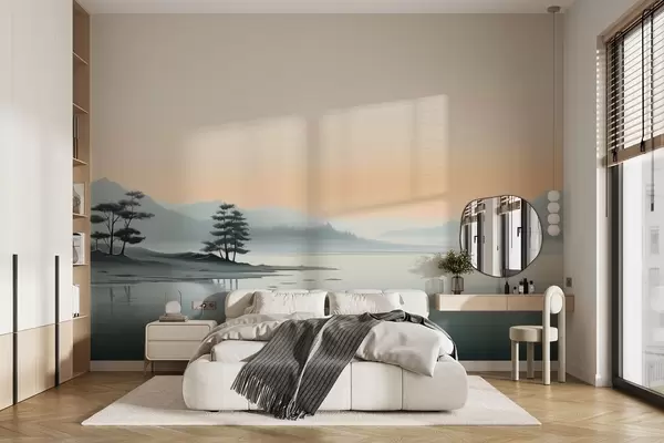Тапете за зид Минималистички пејзаж са магловитим планинама и језером бр. w09151
