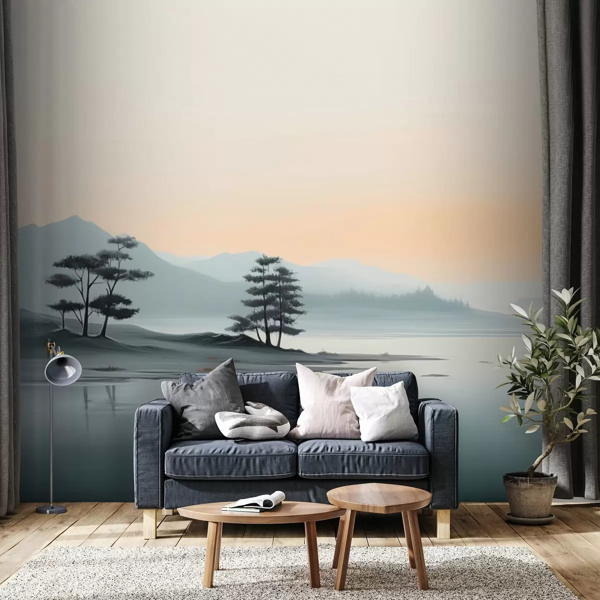 Тапете за зид Минималистички пејзаж са магловитим планинама и језером бр. w09151
