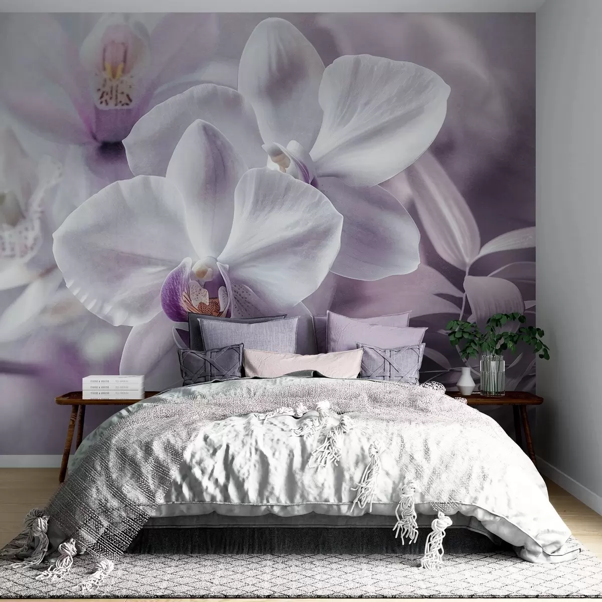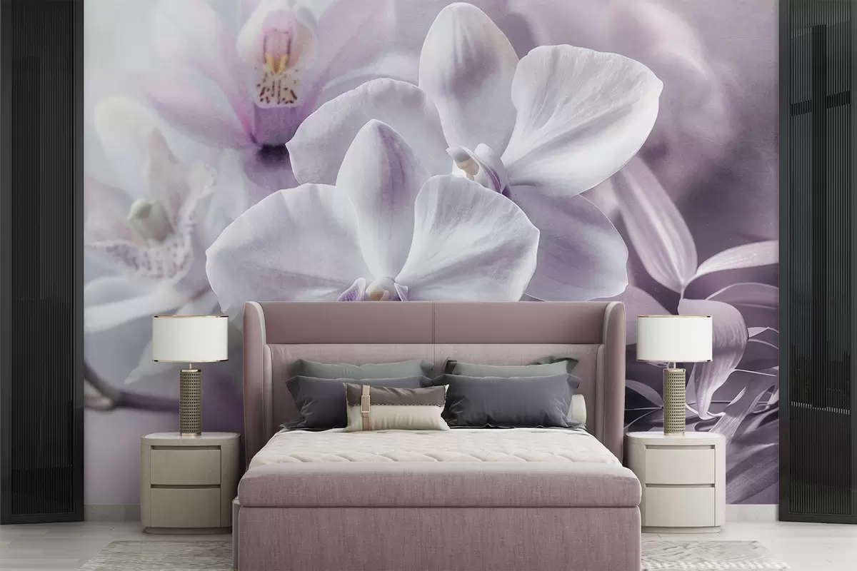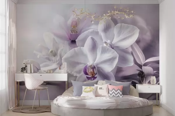 Тапете за зид Бели и јорговани нежни цветови орхидеје, меко осветљење и замућена текстурирана позадина бр. w09155