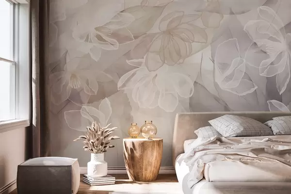 Тапете за зид Цветови и листови са провидним латицама у нијансама беле, беж и љубичасте, меки и нежни бр. w09158