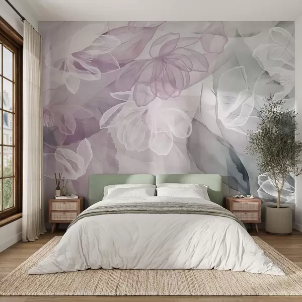 Тапете за зид Цветови и листови са провидним латицама у нијансама беле, ружичасте и зелене, меки и нежни бр. w09158v1