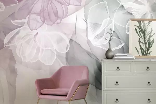Тапете за зид Цветови и листови са провидним латицама у нијансама беле, ружичасте и зелене, меки и нежни бр. w09158v1