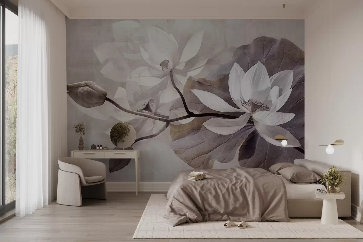 Тапете за зид Зрнасто текстурирани пригушени нежни цветови лотоса са листовима и стабљикама у мекој, беж палети боја бр. w09159