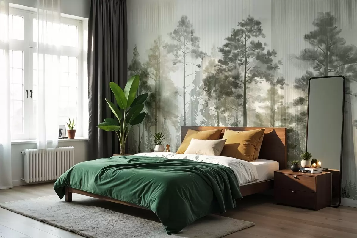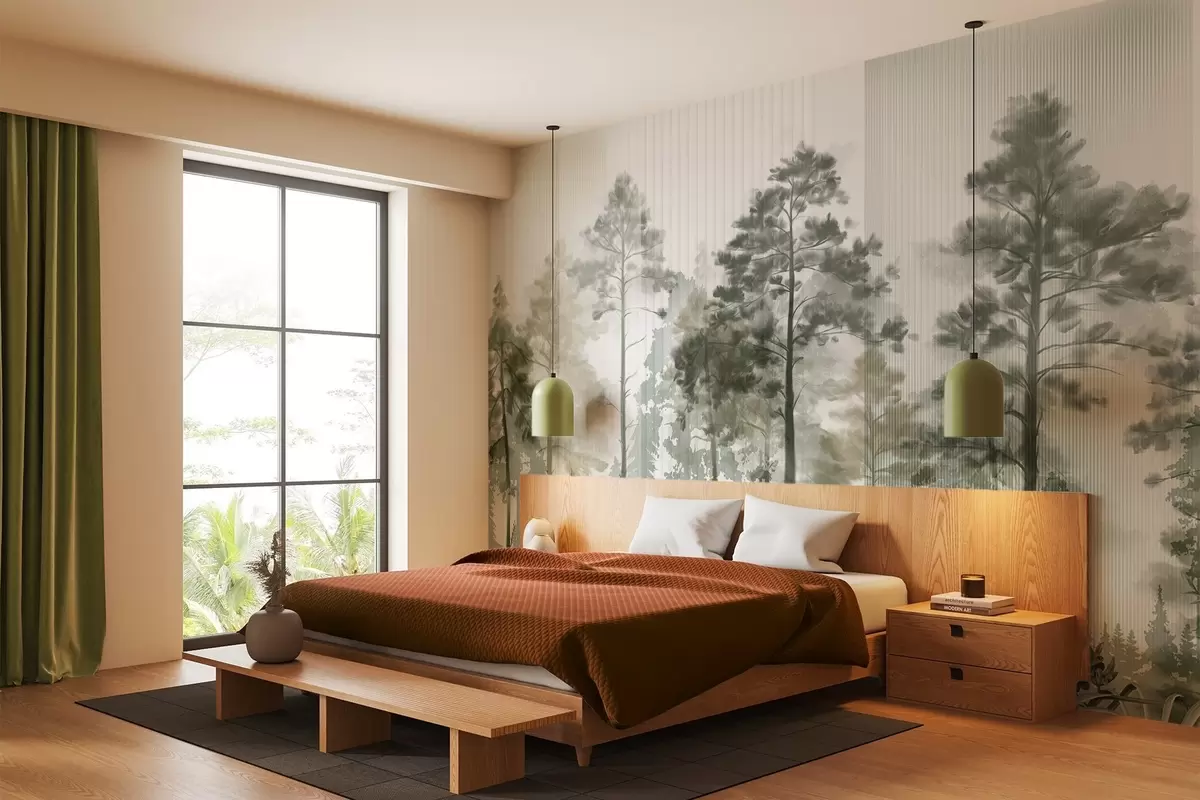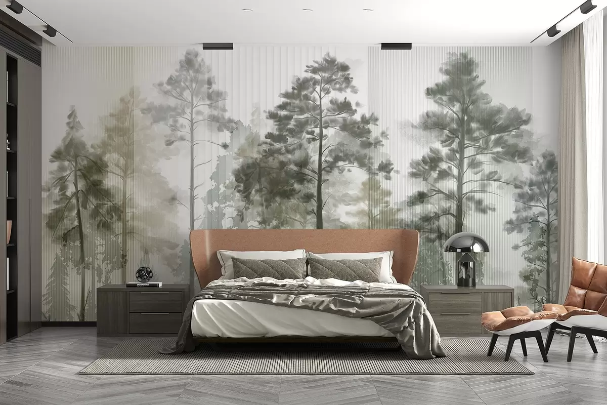 Тапете за зид Густа шума са високим боровима, бујним зеленим лишћем, магловитом атмосфером са текстурама вертикалних линија бр. w09163