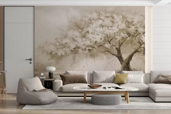 Тапете за зид Апстрактно беж дрво у пуном цвету, поред реке, меки текстурирани потези четкицом и пастелне боје бр. w09193v1