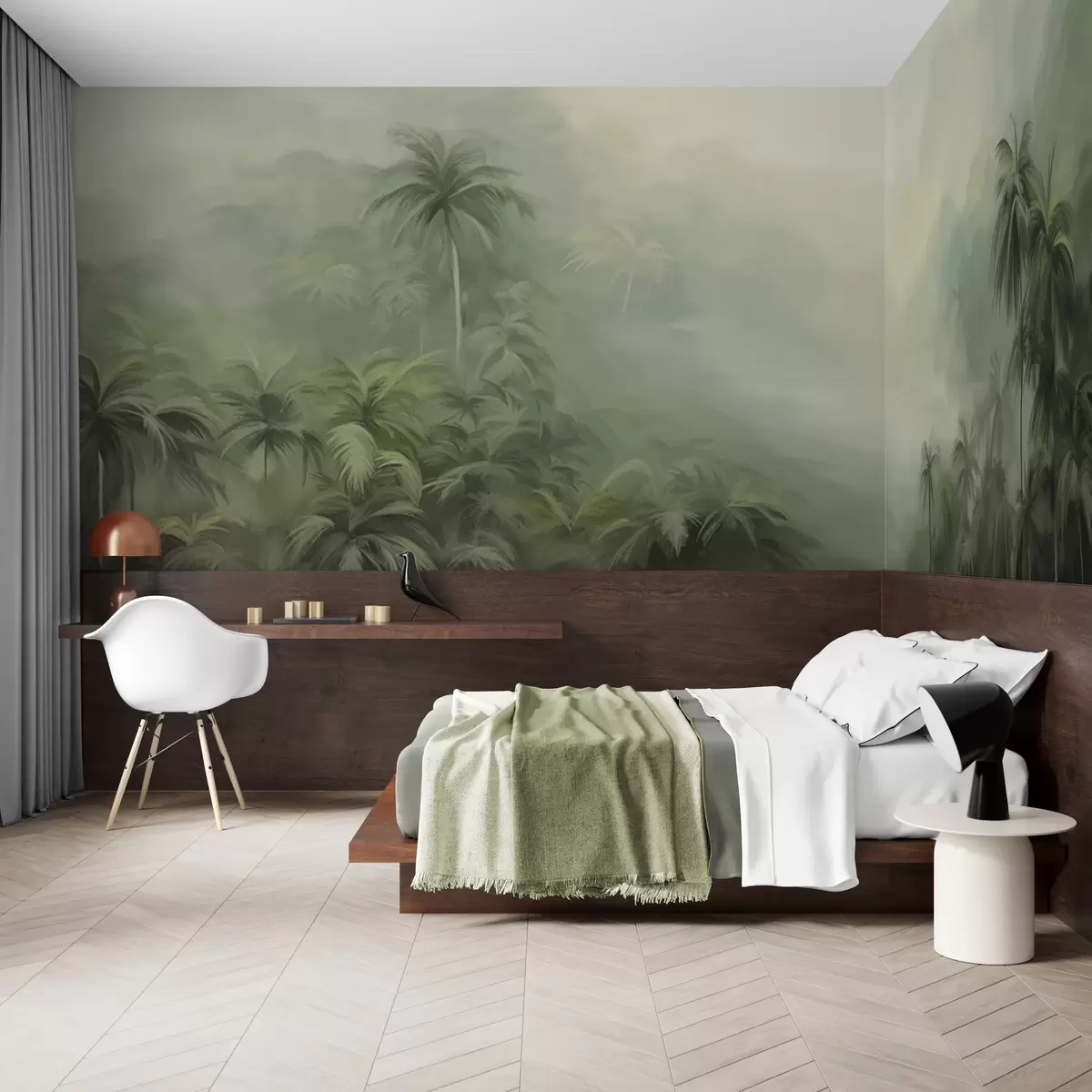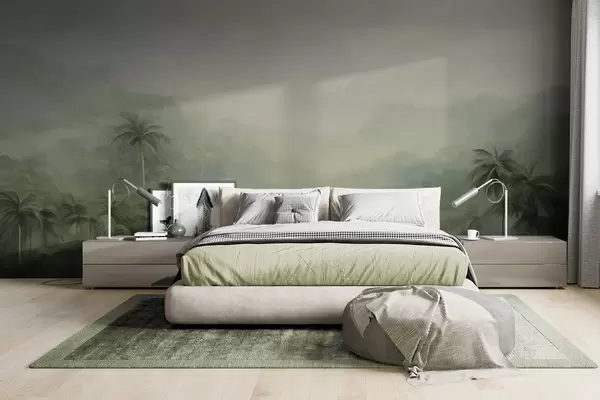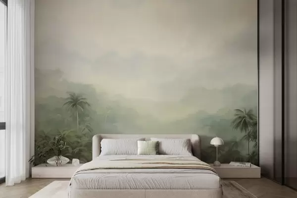 Тапете за зид Гунгл пејзаж са бујним зеленим палмама и валовитим брдима, меке пастелне боје, имитација текстурираног сликања бр. w09194