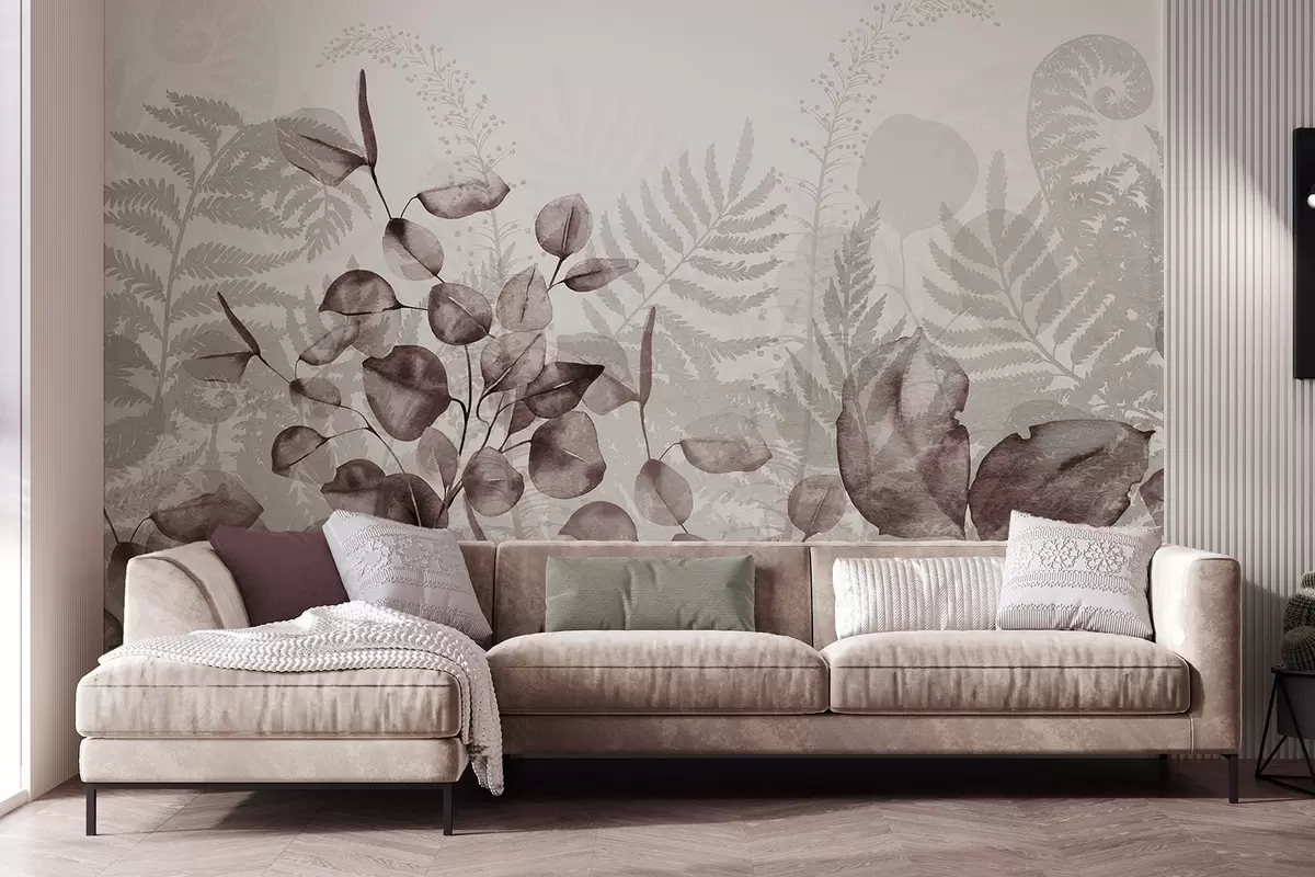 Тапете за зид Листови еукалиптуса и папрати у нијансама бордо и сиве, ефекат акварела, ботаничка илустрација бр. w09197v1