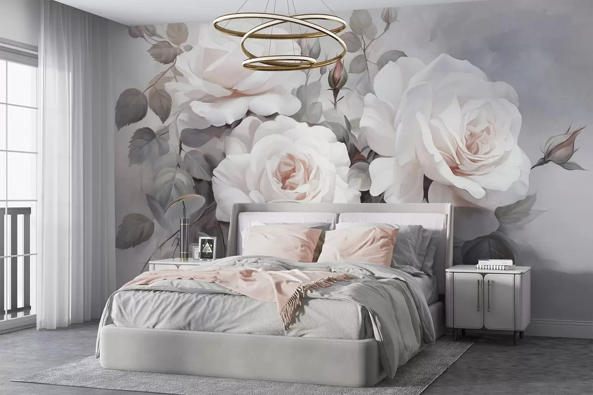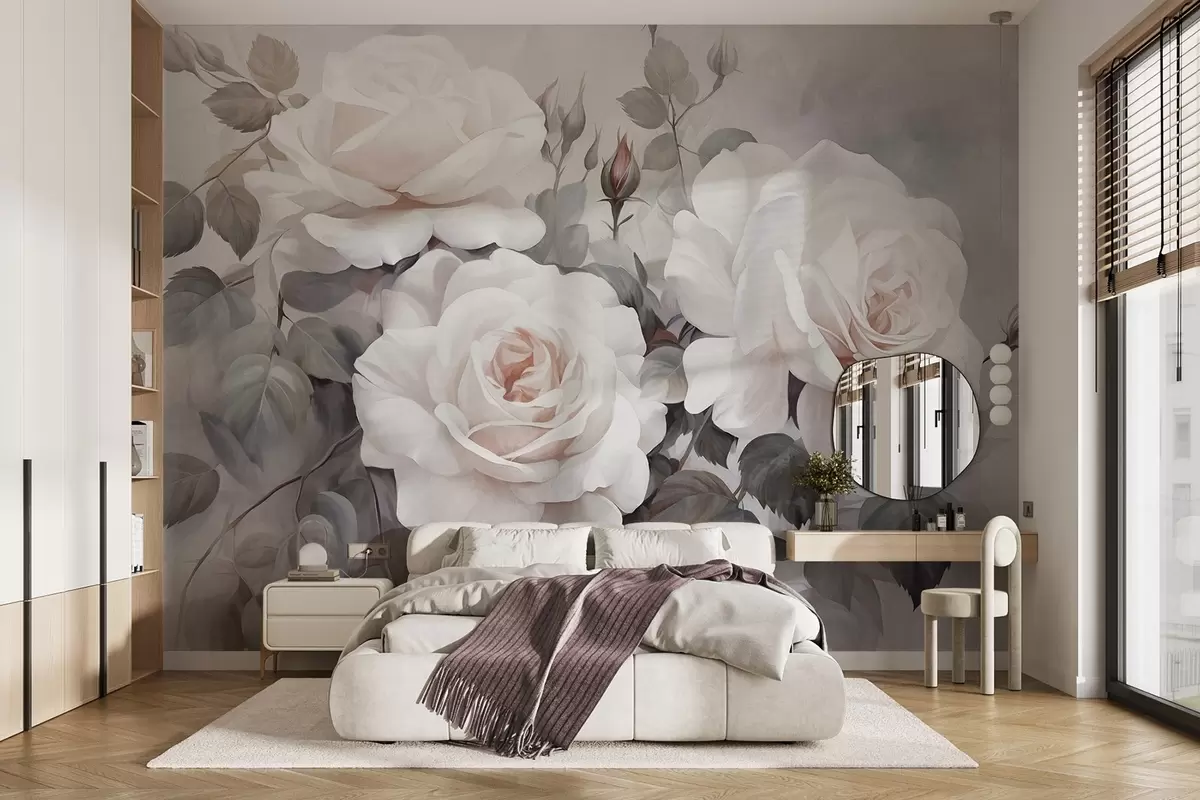 Тапете за зид Текстуриране беле руже са листовима и стабљикама, меке пригушене пастелне боје, елегантан винтаге стил, нежни потези четкицом бр. w09198