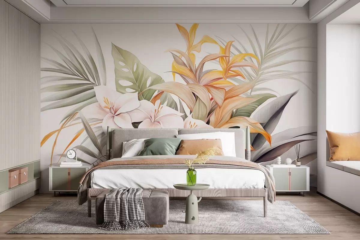 Тапете за зид Ботаничка илустрација тропског цвећа са листовима палми и монстере, меке боје, акварел стил бр. w09201