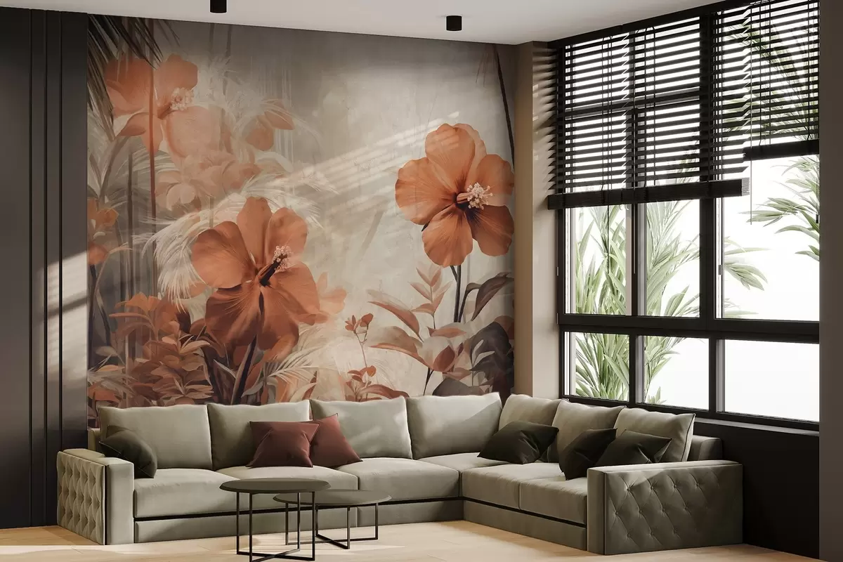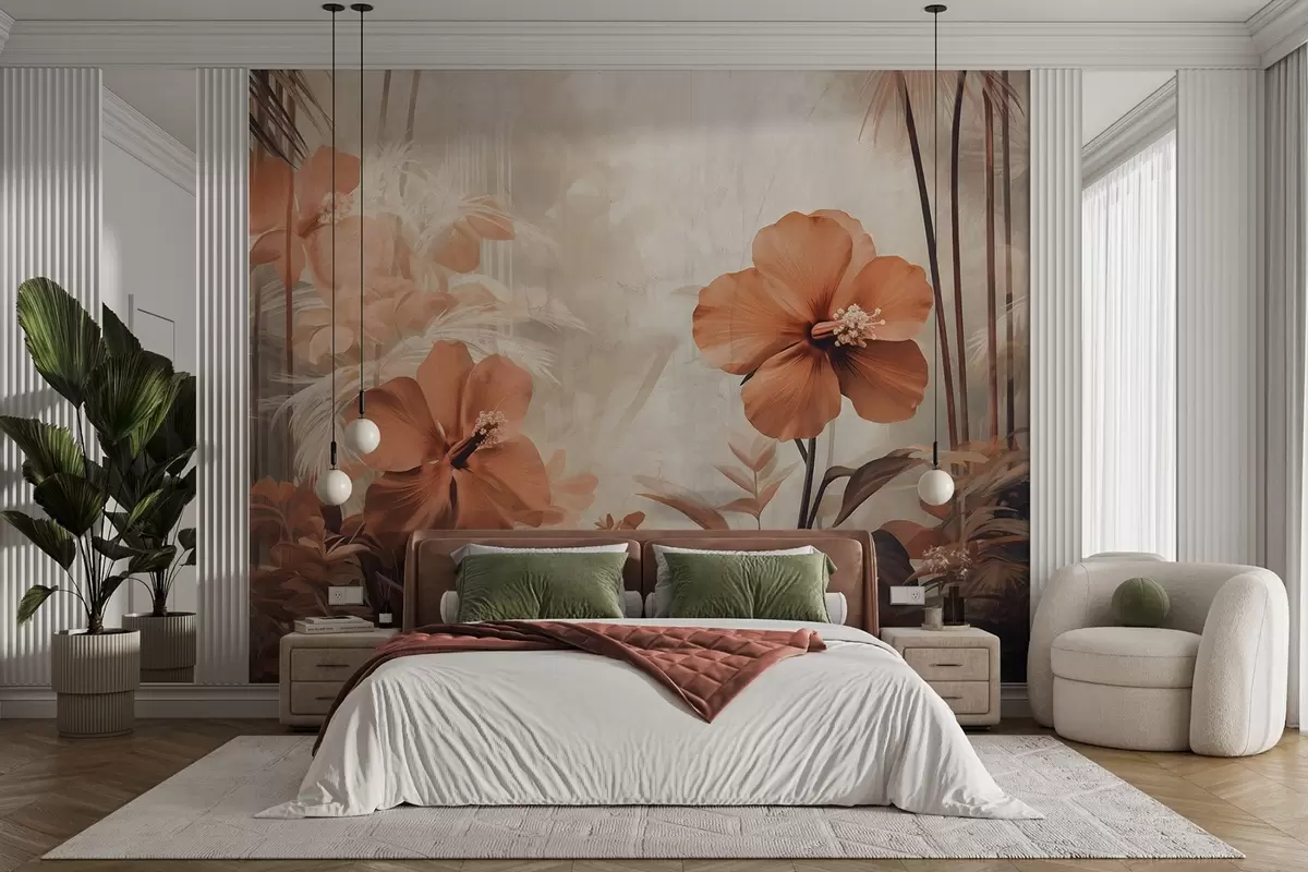Тапете за зид Пастелно црвени цветови хибискуса са листовима и стабљикама, тропска вегетација, меке, пригушене боје, винтаге стил бр. w09203