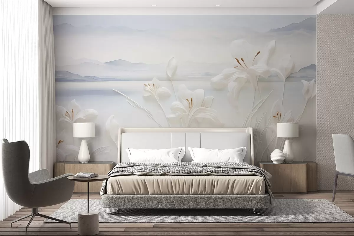 Тапете за зид Бели љиљани са дугим стабљикама и листовима, планине и језеро у позадини, минималистичка пејзажна композиција бр. w09206