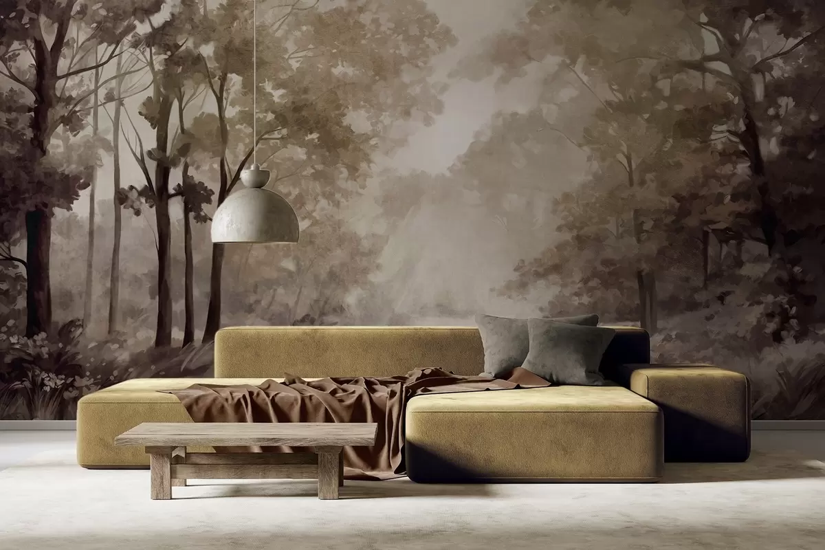 Тапете за зид Текстурирани шумски пејзаж, дрвеће са беж и смеђим листовима, пастелна палета боја бр. w09210