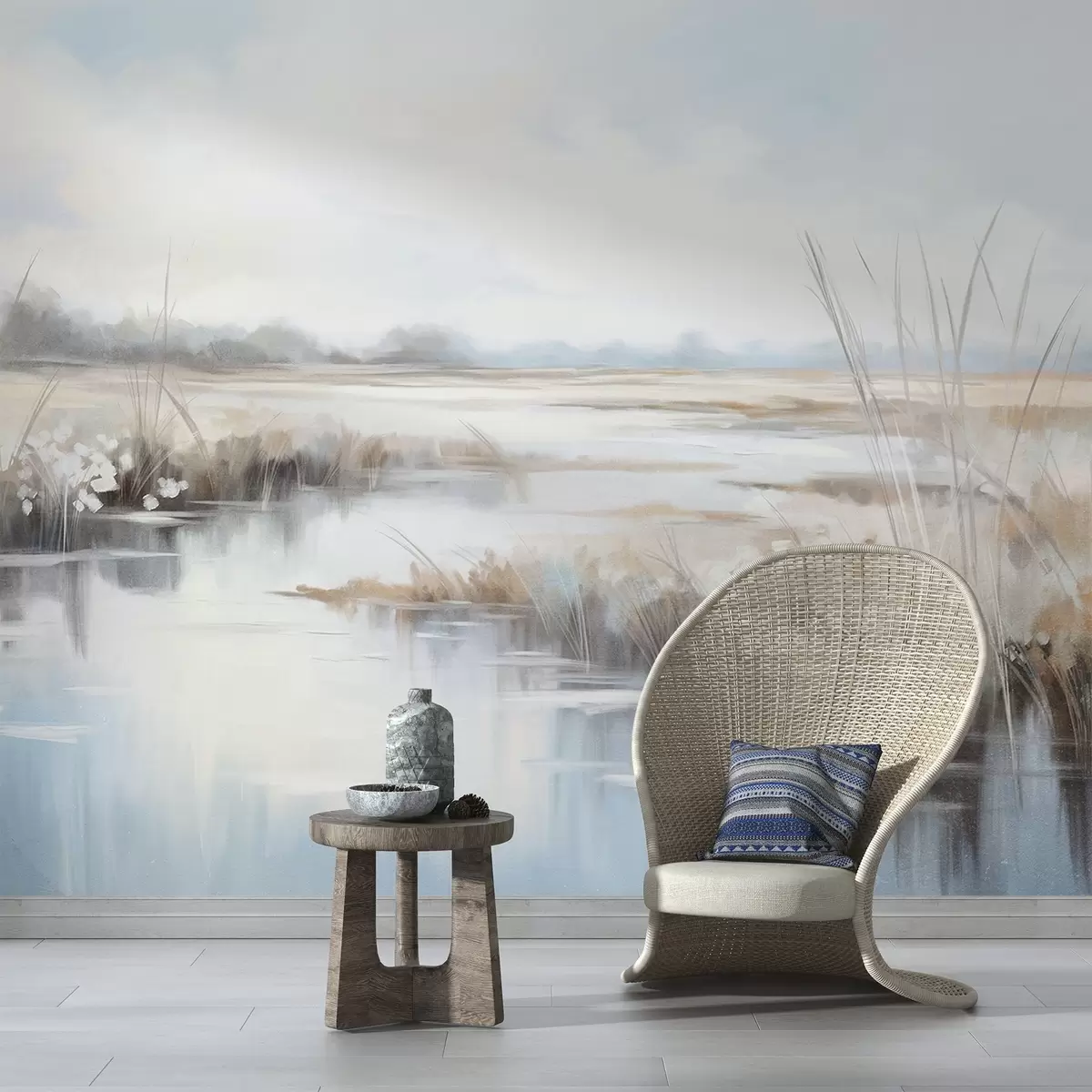 Тапете за зид Текстурирани мирни пејзаж са високим травама и мирном водом, меким пастелним бојама, удаљеним дрвећем на хоризонту бр. w09213