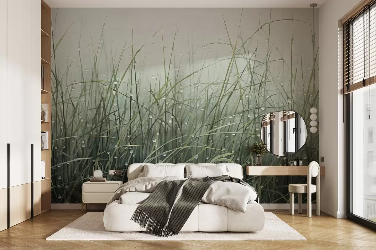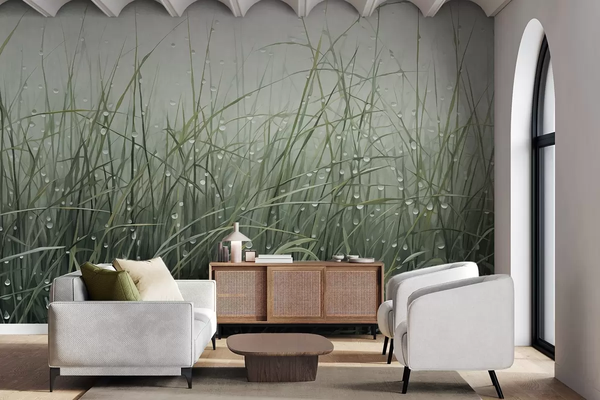 Тапете за зид Трава са капљицама воде, пригушене зелене нијансе, меко светло, магловита позадина, апстрактни минималистички текстурирани стил бр. w09217