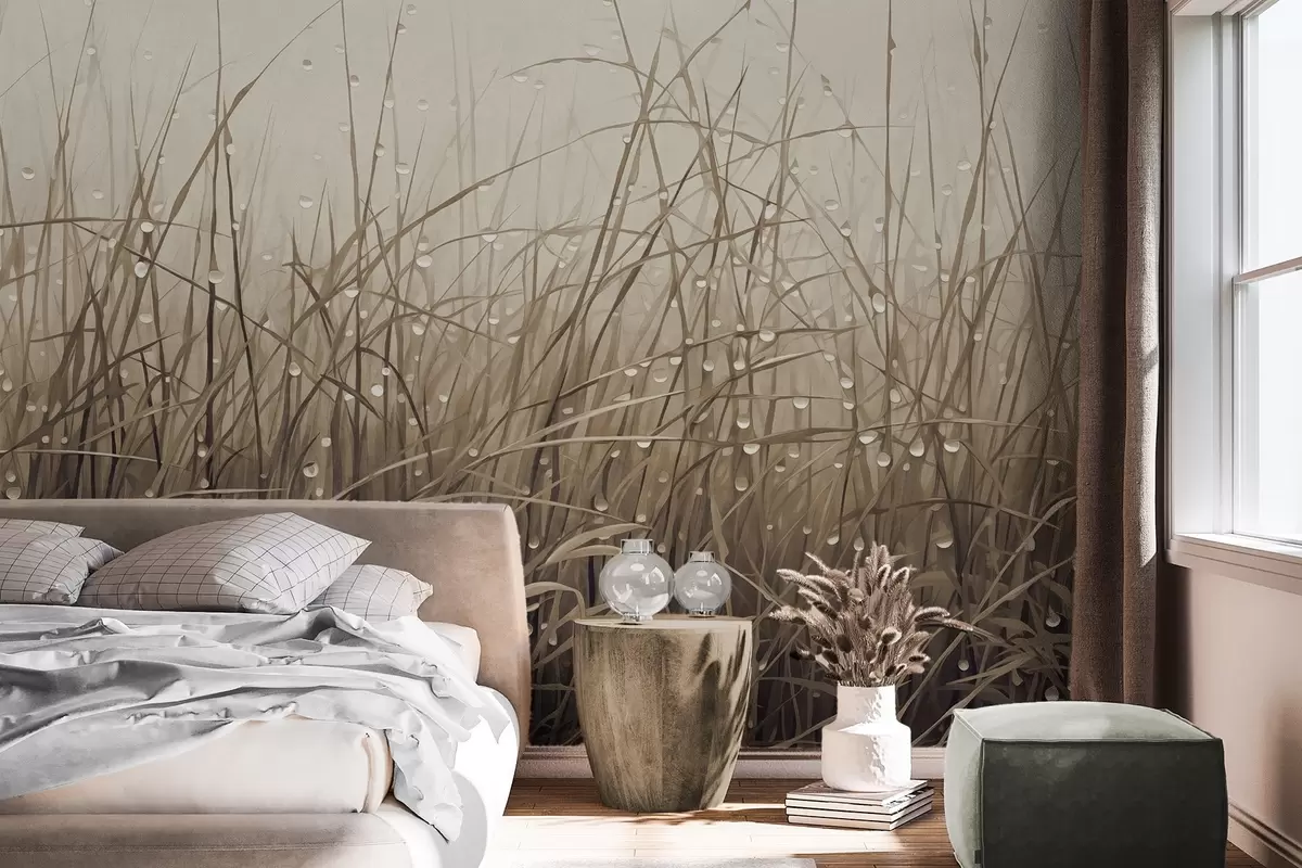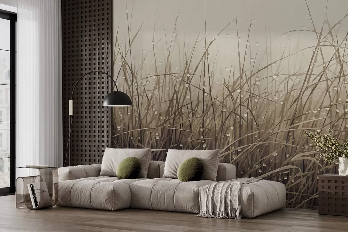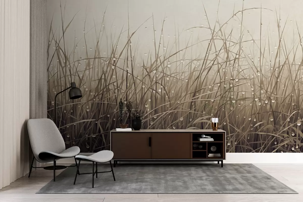 Тапете за зид Трава са капљицама воде, пригушене смеђе нијансе, меко светло, магловита позадина, апстрактни минималистички текстурирани стил бр. w09217v1