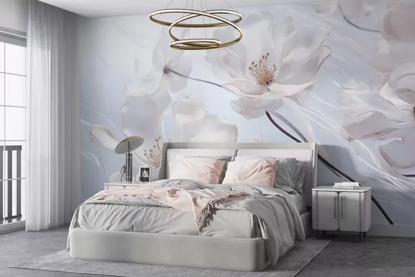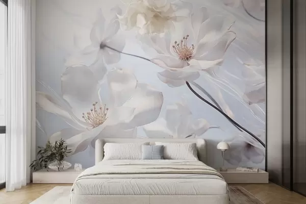 Тапете за зид Бело текстурирано провидно цвеће са нежним латицама, мека светлоплава позадина, елегантно, романтично, сањиво бр. w09233