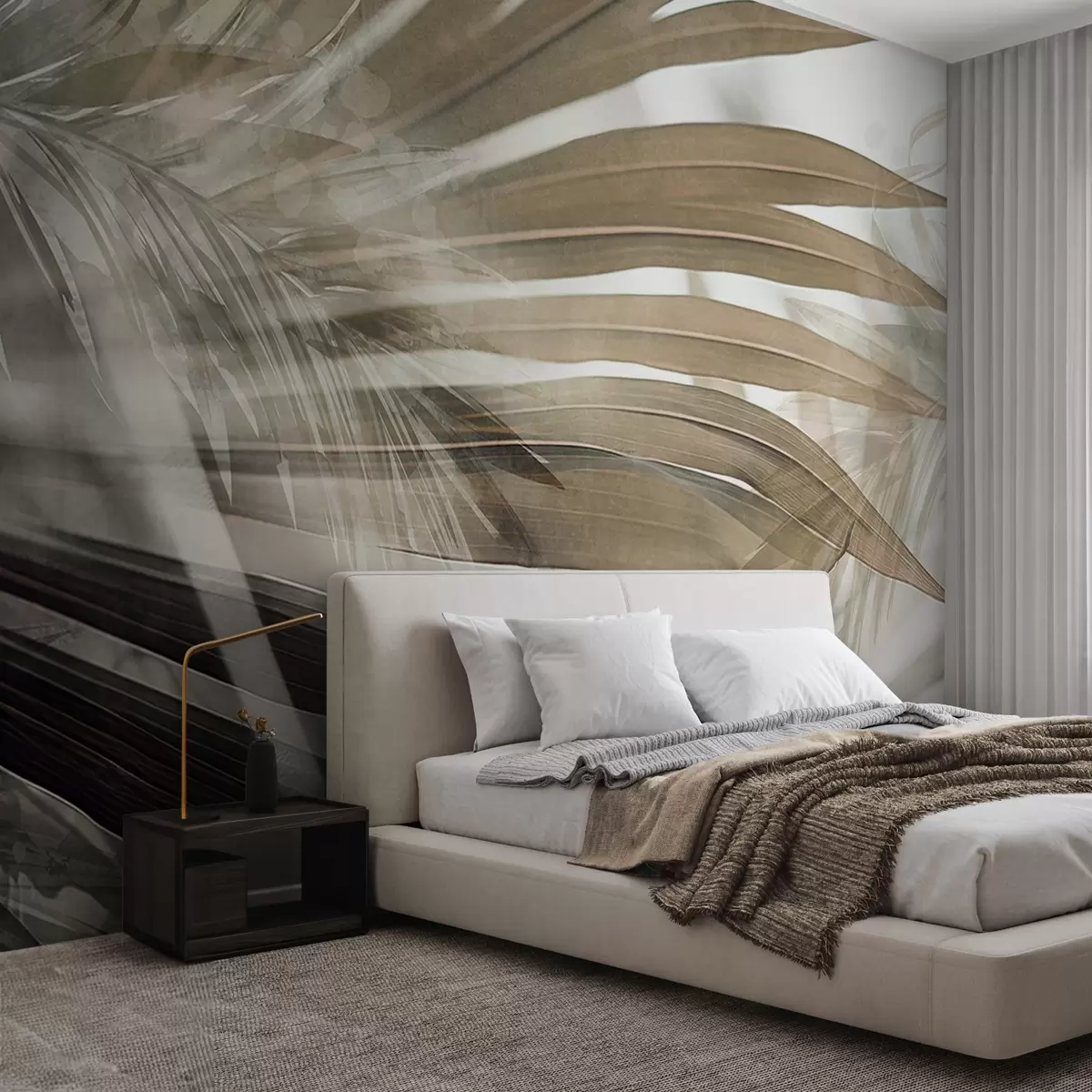 Тапете за зид Палмино лишће светло смеђе нијансе, које се преклапа и ствара слојевити ефекат, на мекој, неутралној позадини бр. w09256
